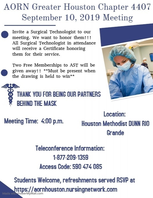 I hope you each had an amazing summer! We look forward to networking with you at our September 10,2019 meeting! Let’s start the new chapter year off with excellent attendance! Invite a Surgical Technologist