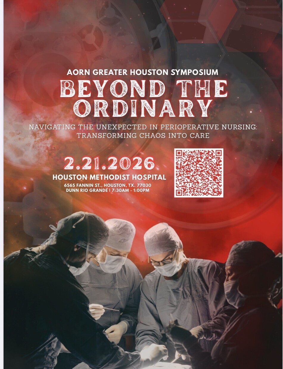 The AORN of Greater Houston is excited to invite you to our 2026 Symposium: Beyond the Ordinary Navigating the Unexpected in Perioperative Nursing Transforming Chaos into Care on February 21st at Houston Methodist Hospital. We’d love for you to join us for a day.